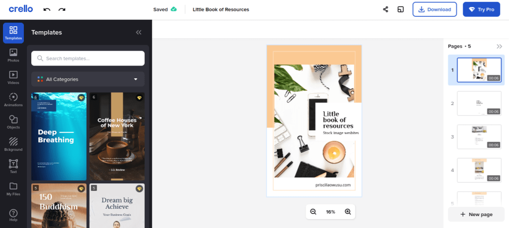 Another design tool for your consideration is Crello. It helps you to create images for print, social media and websites. It works in exactly the same way as Canva with its templates for social media posts, brochures, posters, presentations etc. Once you’ve chosen a template you can then customise using the free backgrounds, icons, styles, images provided or pay a small fee for the premium ones. Personally I don’t think the free images are all that, but you can upload your own easily enough. I also find the editor a lot more tricky to use but it may be that the pro version offers more flexibility as well as choice. Even so it’s still a worthwhile consideration.